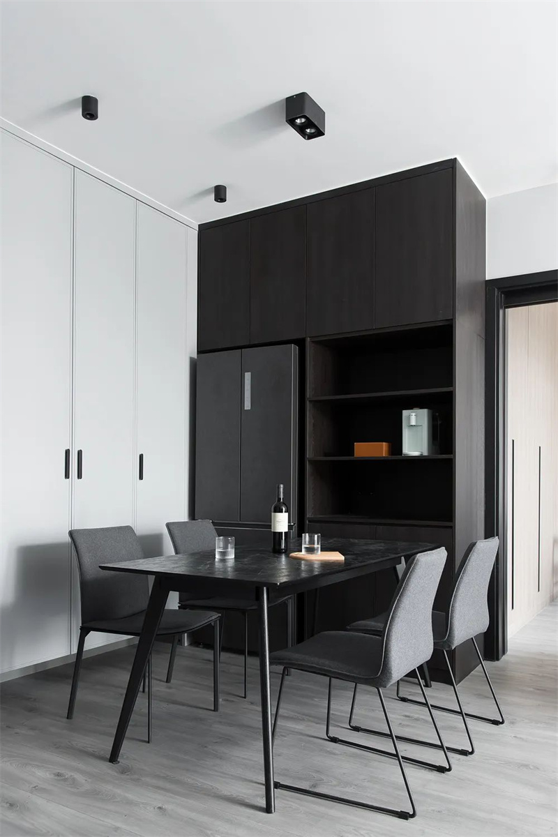 餐廳延續了整體的簡約優雅設計風格,以黑色大理石臺面的餐桌為中心,配以灰色布藝餐椅。旁邊的餐邊柜和嵌入式冰箱完美融合,使整個空間顯得清新、簡約和寬敞舒適。