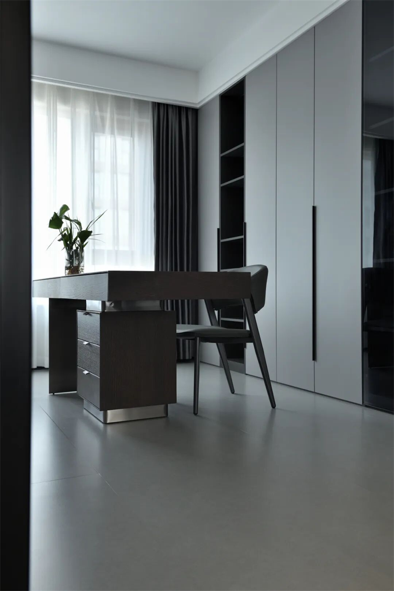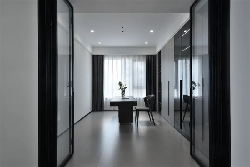 書房空間通透寧?kù)o,以灰白為主調(diào)。黑色金屬框玻璃門隔斷,既保證私密性,又不影響采光與視線通透。室內(nèi)地面鋪設(shè)灰色啞光地磚,墻面簡(jiǎn)潔無(wú)飾,突出空間的純粹感。整體布局簡(jiǎn)潔有序,摒棄多余裝飾,打造一個(gè)安靜、高效、富有質(zhì)感的獨(dú)立思考與工作空間,讓思緒在靜謐中自由流淌。