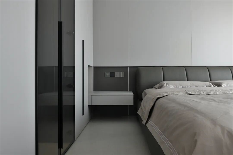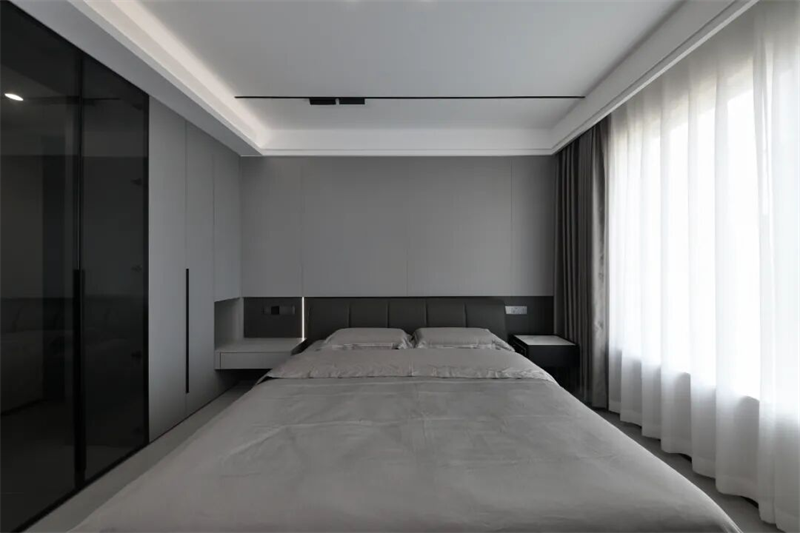 主臥床頭背景墻采用整面定制護(hù)墻板設(shè)計(jì),軟包床頭靠背舒適貼合,搭配淺灰色床品,低調(diào)中透出高級(jí)質(zhì)感。兩側(cè)懸空床頭柜設(shè)計(jì)輕盈實(shí)用,內(nèi)置隱藏式燈帶,提供柔和夜光照明,兼顧美觀與功能性。大窗戶配白色紗簾與深色遮光簾,自然光可自由調(diào)節(jié),保證私密性的同時(shí)引入柔和光線。頂部無(wú)主燈設(shè)計(jì),結(jié)合線性燈帶與筒燈,營(yíng)造層次分明的燈光氛圍。