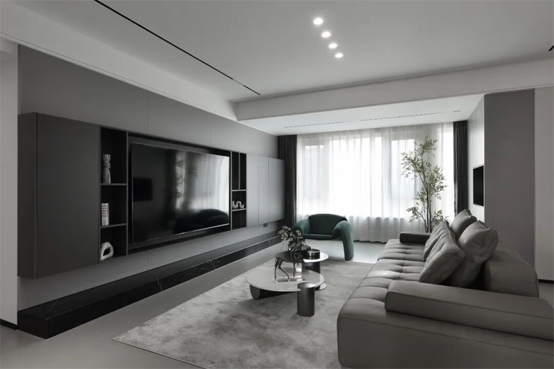 客廳以現(xiàn)代極簡(jiǎn)風(fēng)格為基調(diào),整體采用灰黑配色,營(yíng)造出沉穩(wěn)內(nèi)斂的空間氣質(zhì)。電視背景墻采用整面定制柜體設(shè)計(jì),深灰色啞光面板與開放式格架結(jié)合,嵌入式電視隱藏其中,視覺(jué)整潔統(tǒng)一。底部黑色大理石基座提升層次感,兼具裝飾與收納功能。