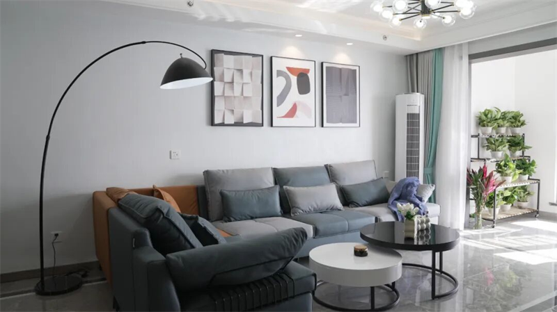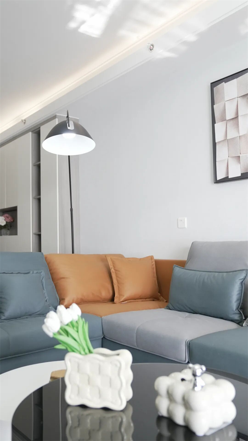 客廳L型布藝沙發選用藍灰與橙色拼接配色,既提升視覺活力,又帶來柔軟舒適的坐感體驗。中央圓形茶幾組合簡潔實用,黑白搭配呼應整體色調。墻上三幅抽象藝術掛畫點綴墻面,增添藝術氣息。一盞黑色弧形落地燈不僅提供局部照明,更成為空間中的點睛之筆。