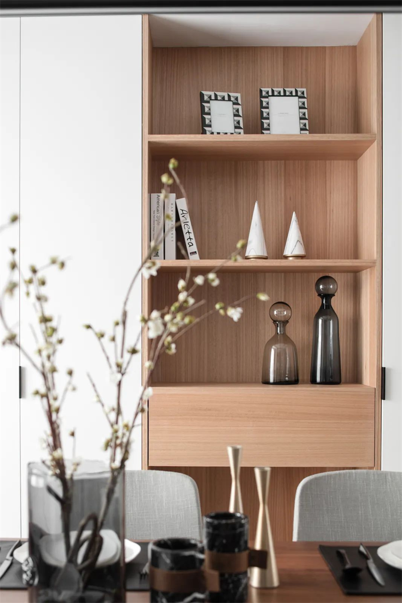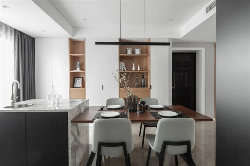 廚房采用現代設計的黑白灰配色方案,櫥柜選用原木色柜面和白色臺面組合,搭配嵌入式電器,創造出極簡的外觀。同時,大理石紋路的地板與墻面,也為廚房增添了質感。