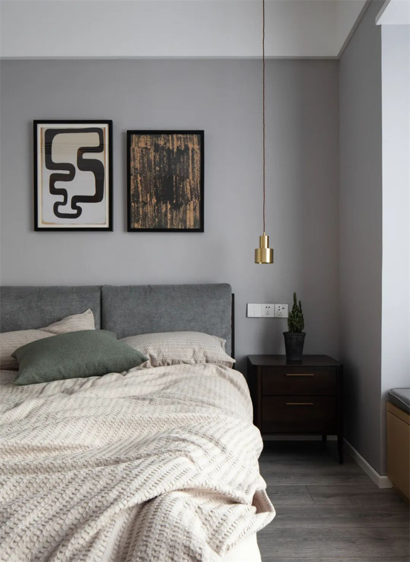 次臥延續了整個住宅的黑白灰現代風格,以淡灰色為主色調,營造出寧靜的氛圍。墻面和窗簾都是白色+淡灰色組合,一張簡約而舒適的雙人床與原木床頭柜相配,增添了自然質感。